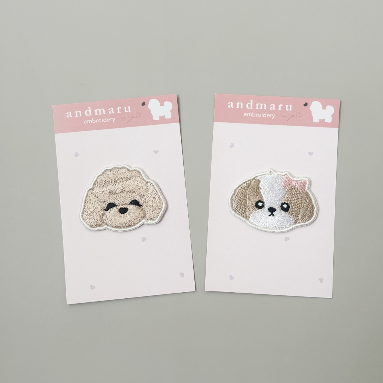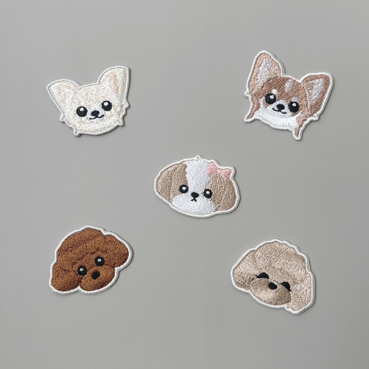 当店人気の刺繍チャームと同じわんこ刺繍を、アイロンで貼れるワッペンに仕立てました
