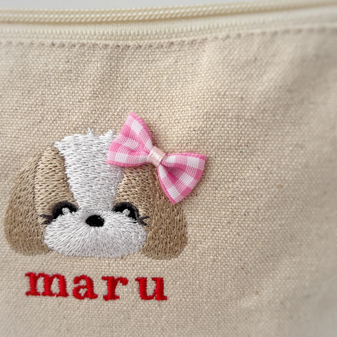 ポーチには、基本デザインの犬刺繍を1匹分お入れしています。