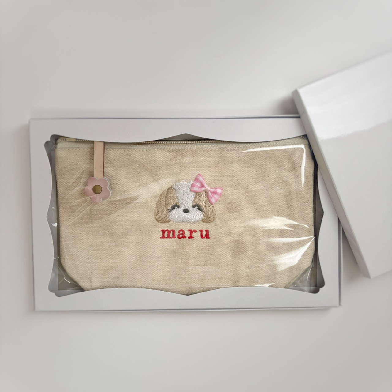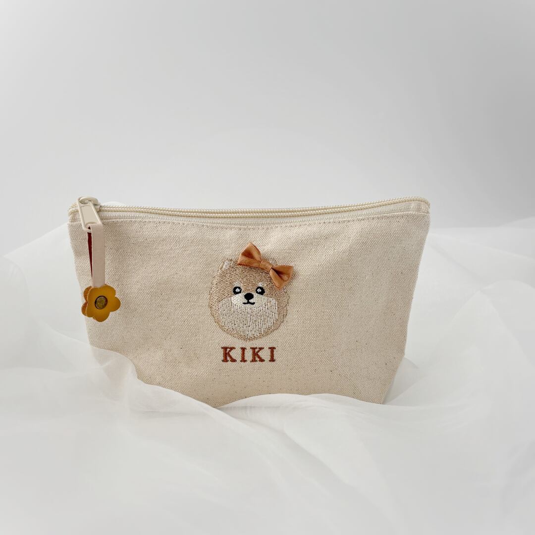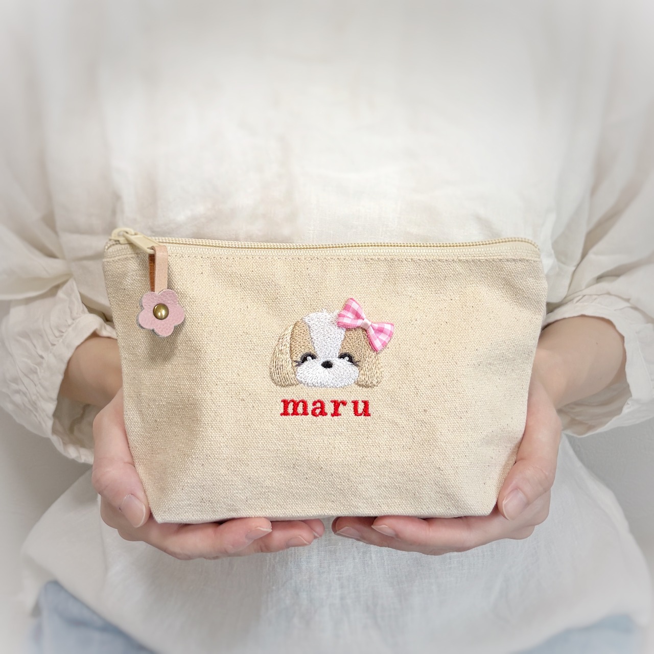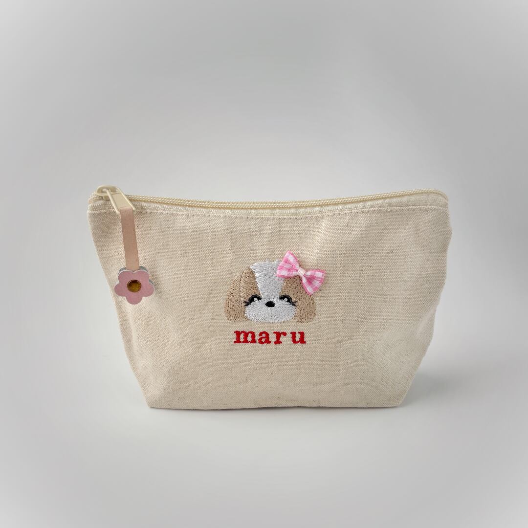 ポーチには、基本デザインの犬刺繍を1匹分お入れしています。