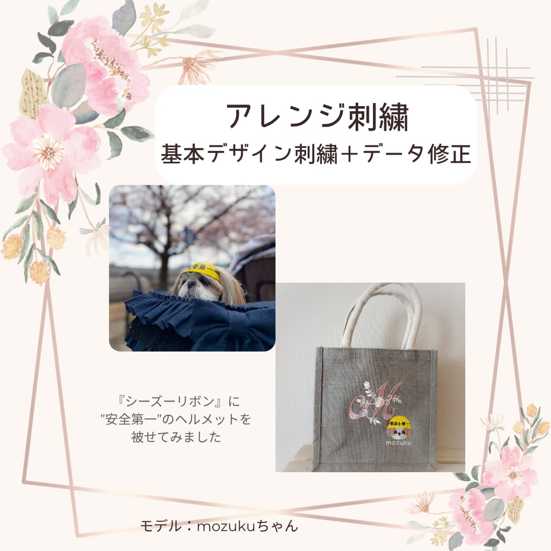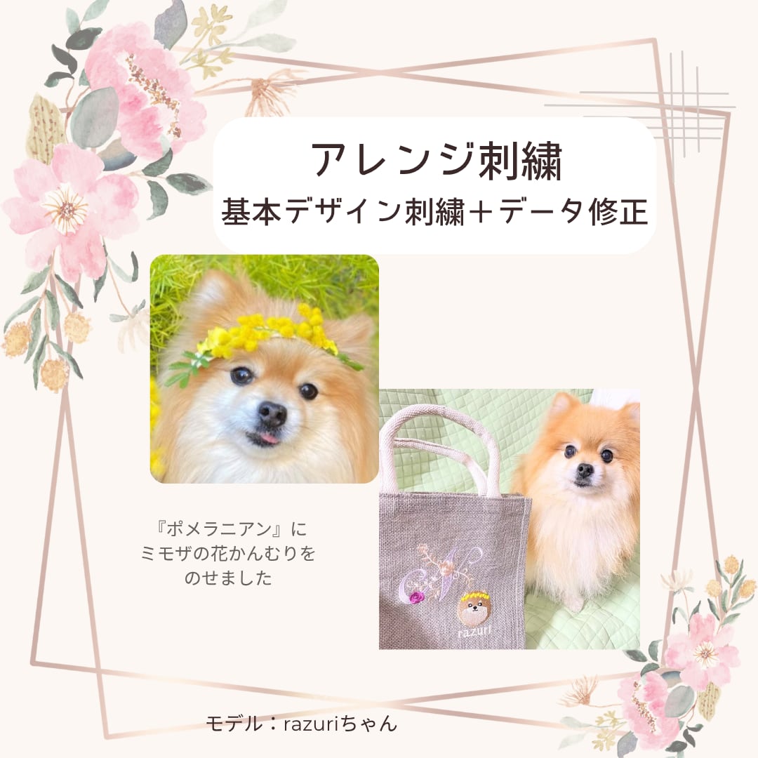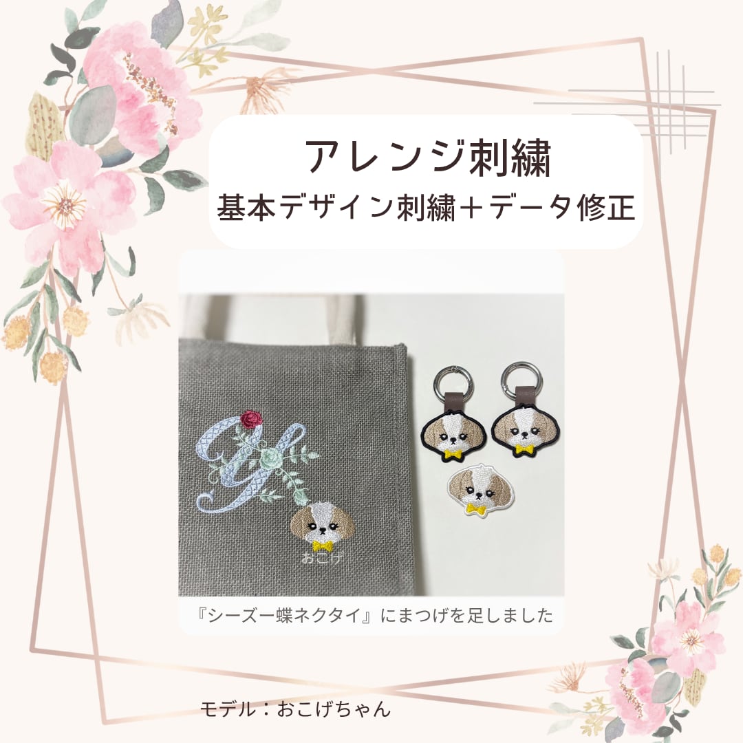 当店の「基本デザイン刺繍」をもとに、髪型アレンジや小物の追加などの修正をご希望の場合にご利用いただくオプション『アレンジ刺繍』です。